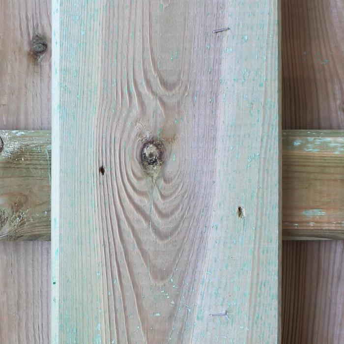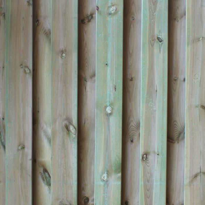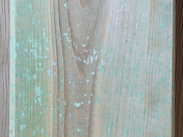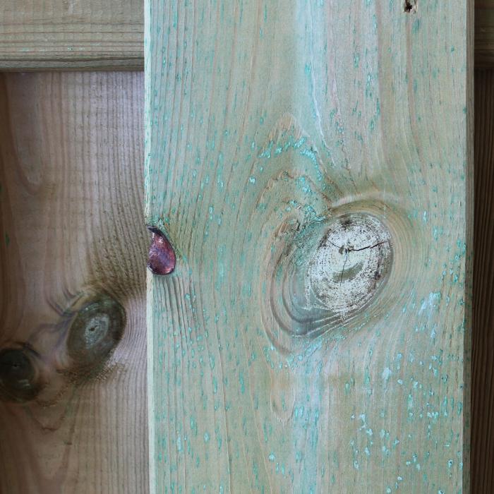 Ein typisches Merkmal für druckimprägniertes Holz sind grün-weiße Ablagerungen von Imprägniersalz und Harz an der Oberfläche. Diese wittern im Laufe der Zeit ab. Bei Bedarf lassen sich die Ablagerungen mit einem Abziehmesser oder Terpentinersatz entfernen.