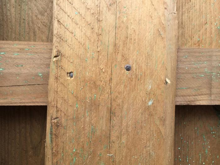 Ein typisches Merkmal für druckimprägniertes Holz sind grün-weiße Ablagerungen von Imprägniersalz und Harz an der Oberfläche. Diese wittern im Laufe der Zeit ab. Bei Bedarf lassen sich die Ablagerungen mit einem Abziehmesser oder Terpentinersatz entfernen.