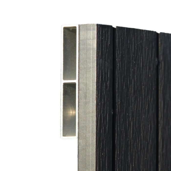 Das für die Zaunbretter verwendete Rohmaterial WPC besteht zu ca. 60% aus Holzfasern und zu ca. 40% aus Kunststoff. Im Verein mit den Zaunriegeln aus Aluminium entsteht ein besonders stabiles Zaunelement.