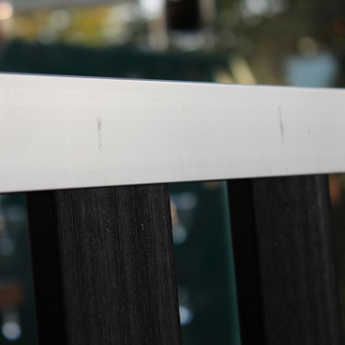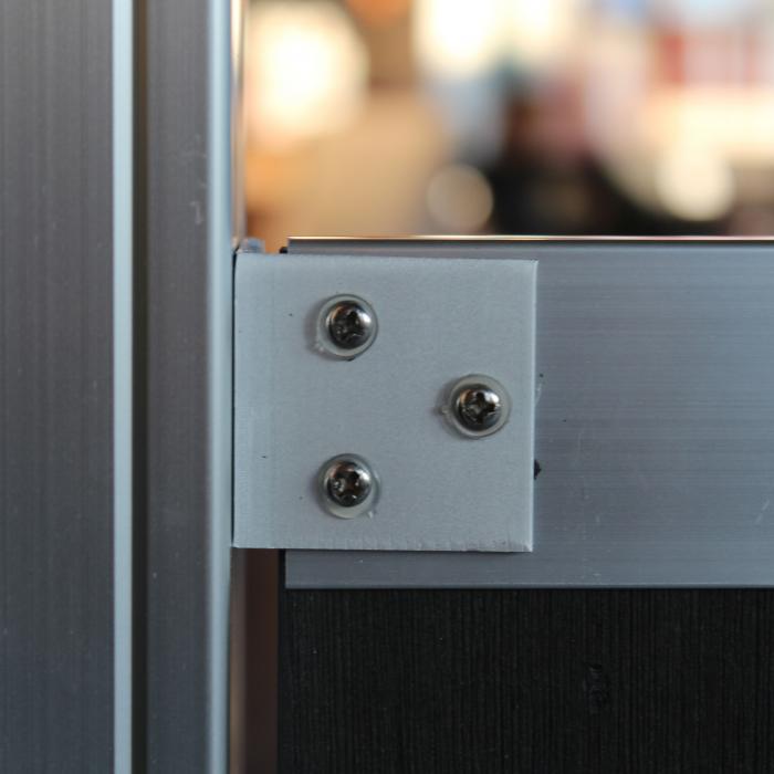 Die senkrechten Zaunleisten aus WPC sind werkseitig mit dem oberen und unteren Rahmen aus Aluminium verschraubt. Die Verschraubung ist von der Vorderseite des Zaunelementes sichtbar.