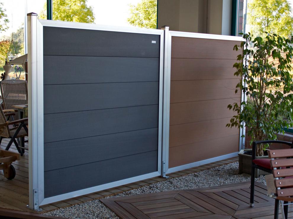 Das Foto zeigt die Zaunelemente Forte in unserer Zaun-Ausstellung in Dülmen im Oktober 2012. Die Zaunanlage zeigt die Kombination der Elemente in den Farbtönen anthrazit und braun. Die in der Ausstellung gewählte Montage der Pfosten mittels Bodenankern zum Aufdübeln ist nur gering belastbar und empfiehlt sich nicht im Außenbereich.