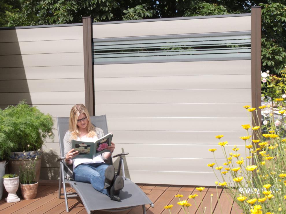 Zur Auflockerung können einzelne Profilbretter durch die Designelemente aus Glas oder Metall ersetzt werden. Zur Montage eines Designelementes wird jeweils ein Adapterleistenset benötigt. Aus statischen Gründen muss als oberstes Brett eines Zaunfeldes jeweils ein Profilbrett aus BPC verwendet werden.