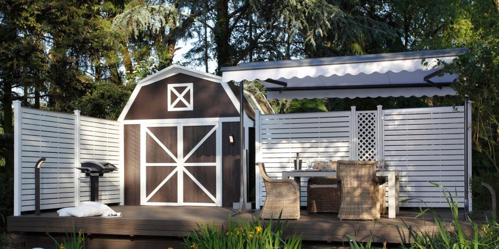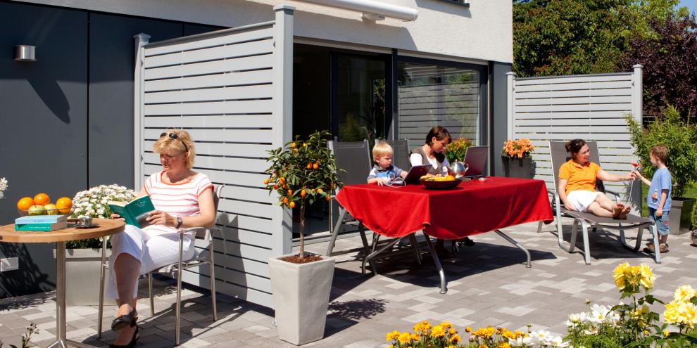 Zaun NOVO-Design in grau als Sichtschutz auf der Terrasse