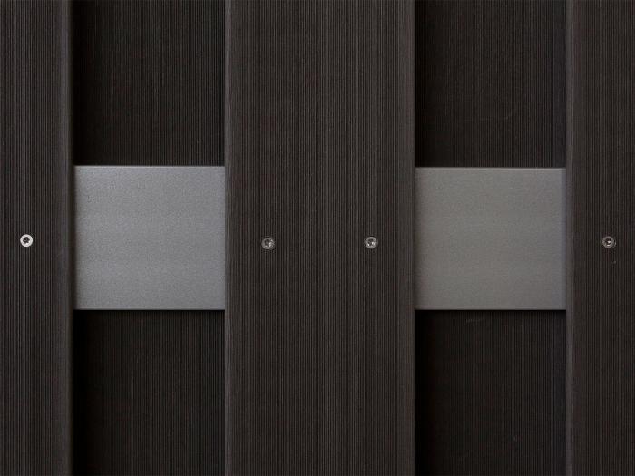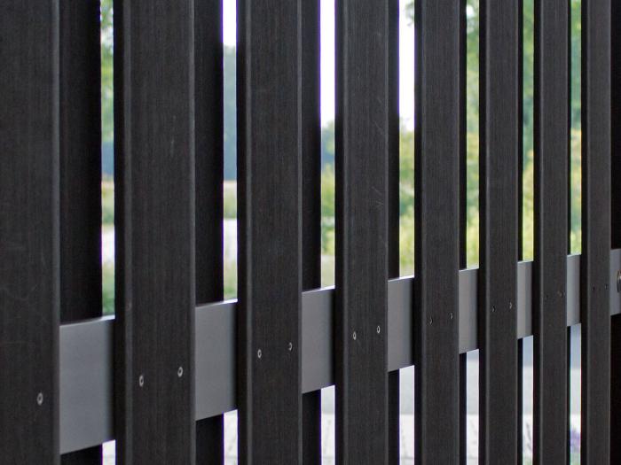 Die Füllung der Sichtschutzzäune der Serie Jumbo-WPC-Alu besteht aus versetzt angeordneten Lamellen, die von horizontal laufenden Riegeln aus Aluminium getragen werden. Die Befestigung der Zaunlamellen auf den Rahmen erfolgt werkseitig mittels Edelstahlschrauben.
