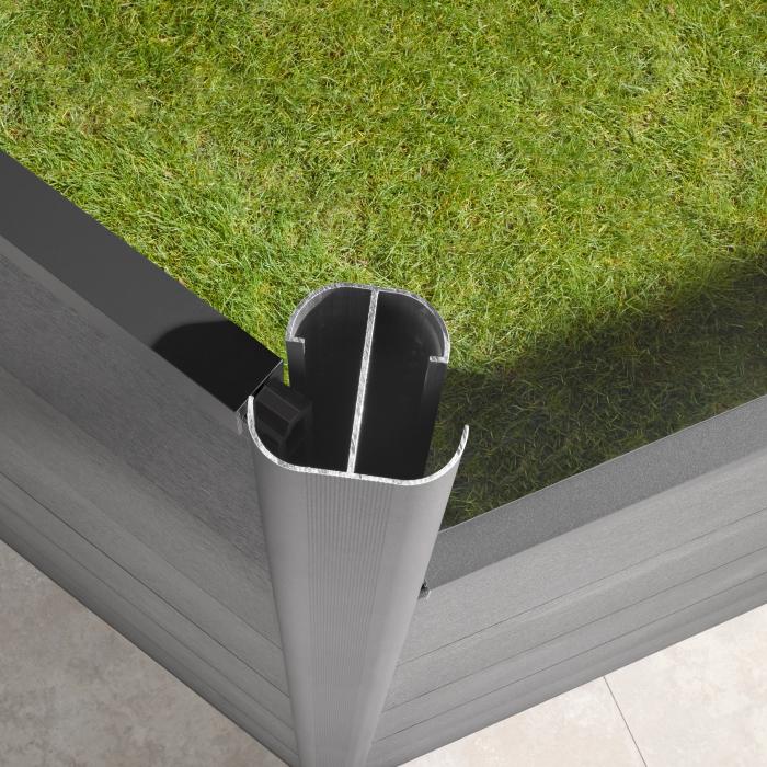 Für verwinkelte Zaunanlagen aus System-WPC gibt es einen praktischen Eckpfosten. Mit diesem Eckpfosten ist die Einstellung des Winkels von 75° bis 180° möglich. Diesen Eckpfosten gibt es sowohl in der Variante zum Aufdübeln als auch zum Einbetonieren.
