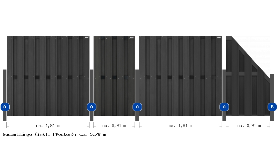 Dimensionen des Zauns Der Zaun erstreckt sich über eine Länge von etwa 578 cm und ist ideal, um größere Bereiche effektiv zu umzäunen, wobei er zusätzlich als Wind- und Sichtschutz dient. Seine gerade Linienführung und die Profile mit jeweils zwei V-Nuten unterstützen ein ordentliches und übersichtliches Design.