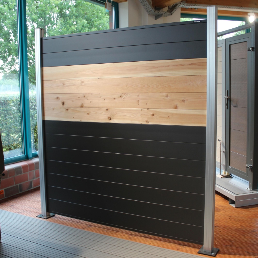 Mit dem Mix and Match Design können individuelle Steckzaun-Konstellationen durch das Kombinieren verschiedener Profilfarben und Materialien aus der gleichnamigen Serie kreiert werden. Zum Set gehören neben Profilen aus Aluminium auch vier Douglasie-Holzprofile, die für eine optische Auflockerung sorgen. Mit seiner Höhe von 190 cm gewährleistet das Steckzaun Set effektiven Schutz vor Wind und ungewollten Blicken.